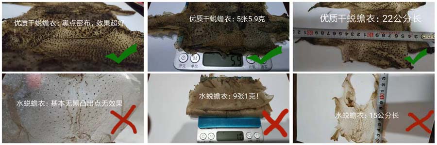 優(yōu)質(zhì)干蛻蟾衣和劣質(zhì)水蛻蟾衣的區別: